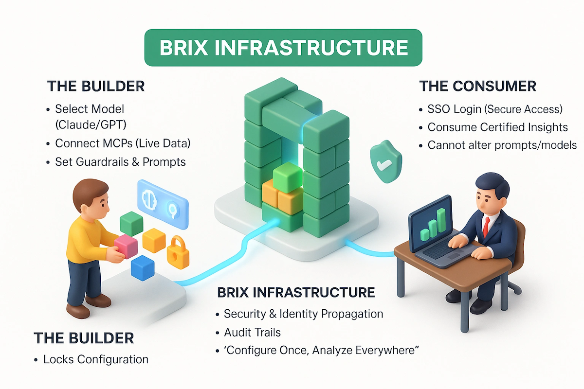 Think of BriX as the “production layer” for AI tools. You bring your working prototype. BriX handles security, scaling, data connections, monitoring, audit trails, and consistent behavior across teams.