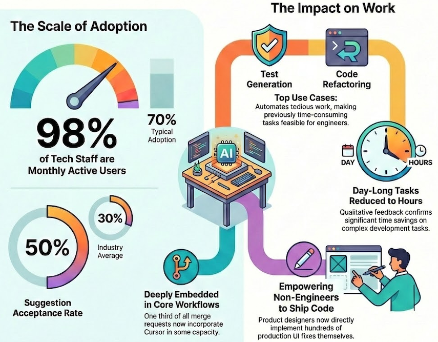Qualitative feedback confirms what the adoption numbers suggest: tasks that took a full day to complete now take hours. Engineers report tackling refactors and test additions they would have otherwise skipped due to time pressure. Cursor doesn’t just speed up existing work; it makes previously impractical work feasible.