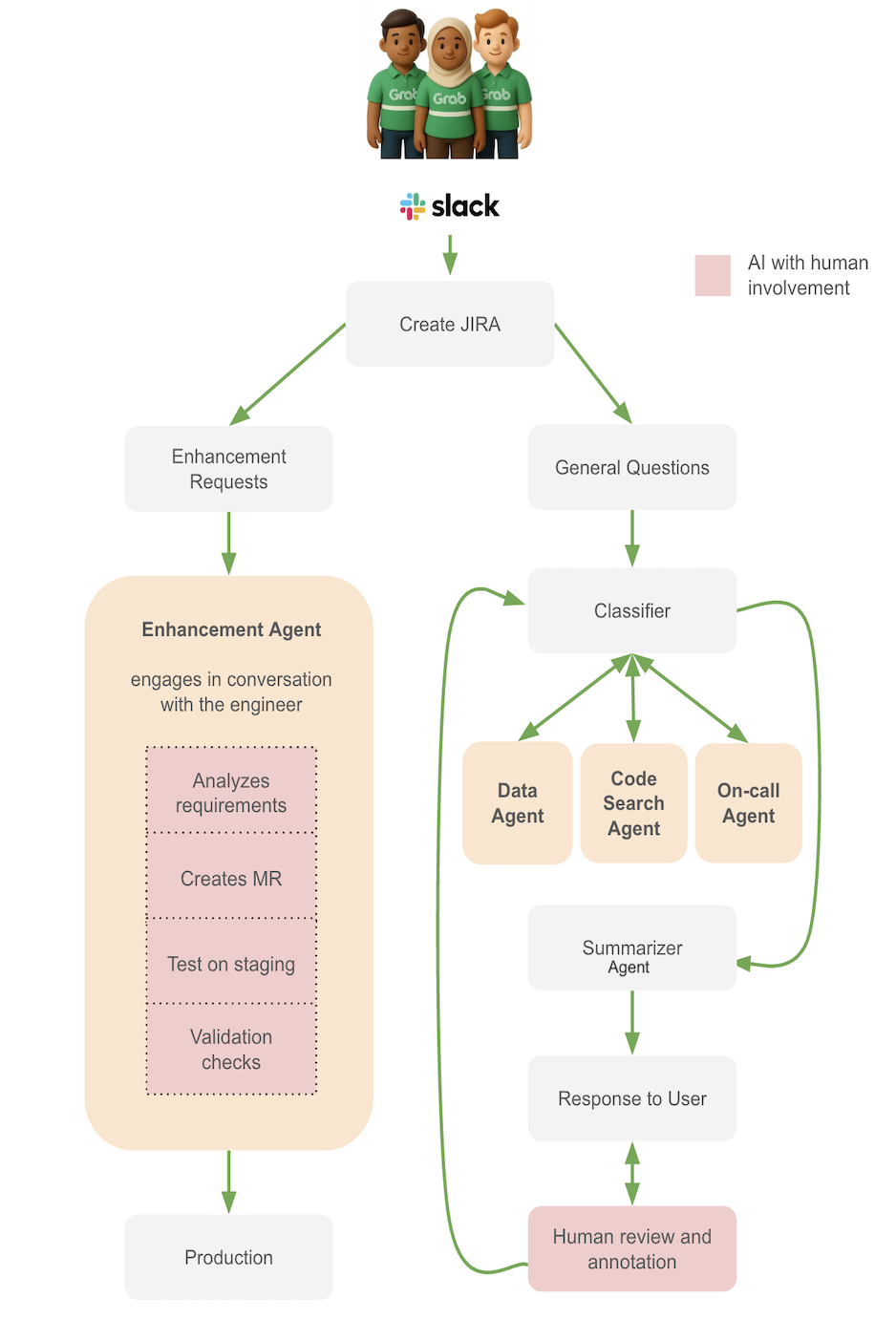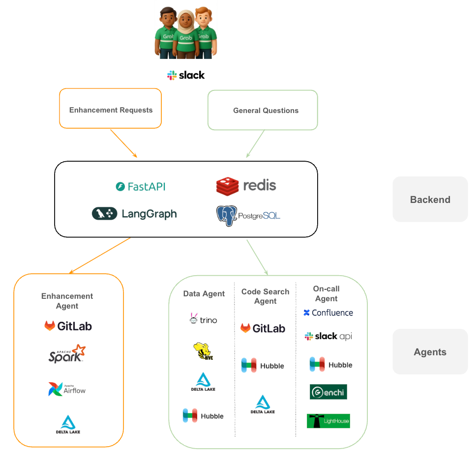 - Enhancement requests: These are routed to the Enhancement Agent, which interacts directly with our core engineering tools like GitLab, Apache Spark, and Airflow to propose and test code changes.