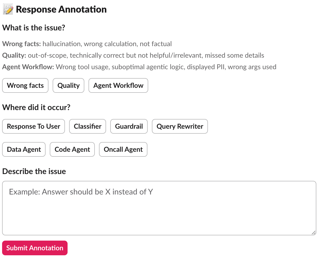 - Automated evaluation: Random annotations are pulled to create test cases for offline evaluation. This ensures the system is tested against real-world failure scenarios, not just synthetic test cases we invented.