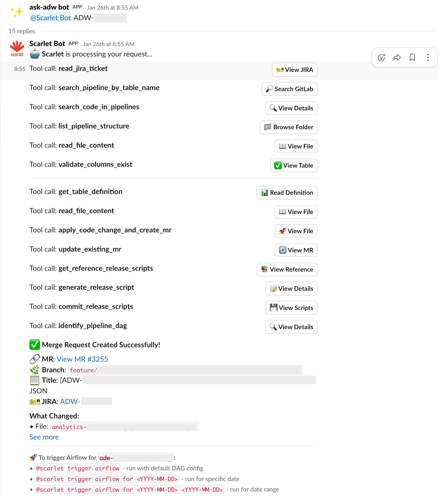 - Enable pipeline execution: Once the MR is validated, users can interact with the bot to trigger the data pipeline and start testing their changes on Airflow. They can optionally specify date ranges or other parameters to control the test runs.