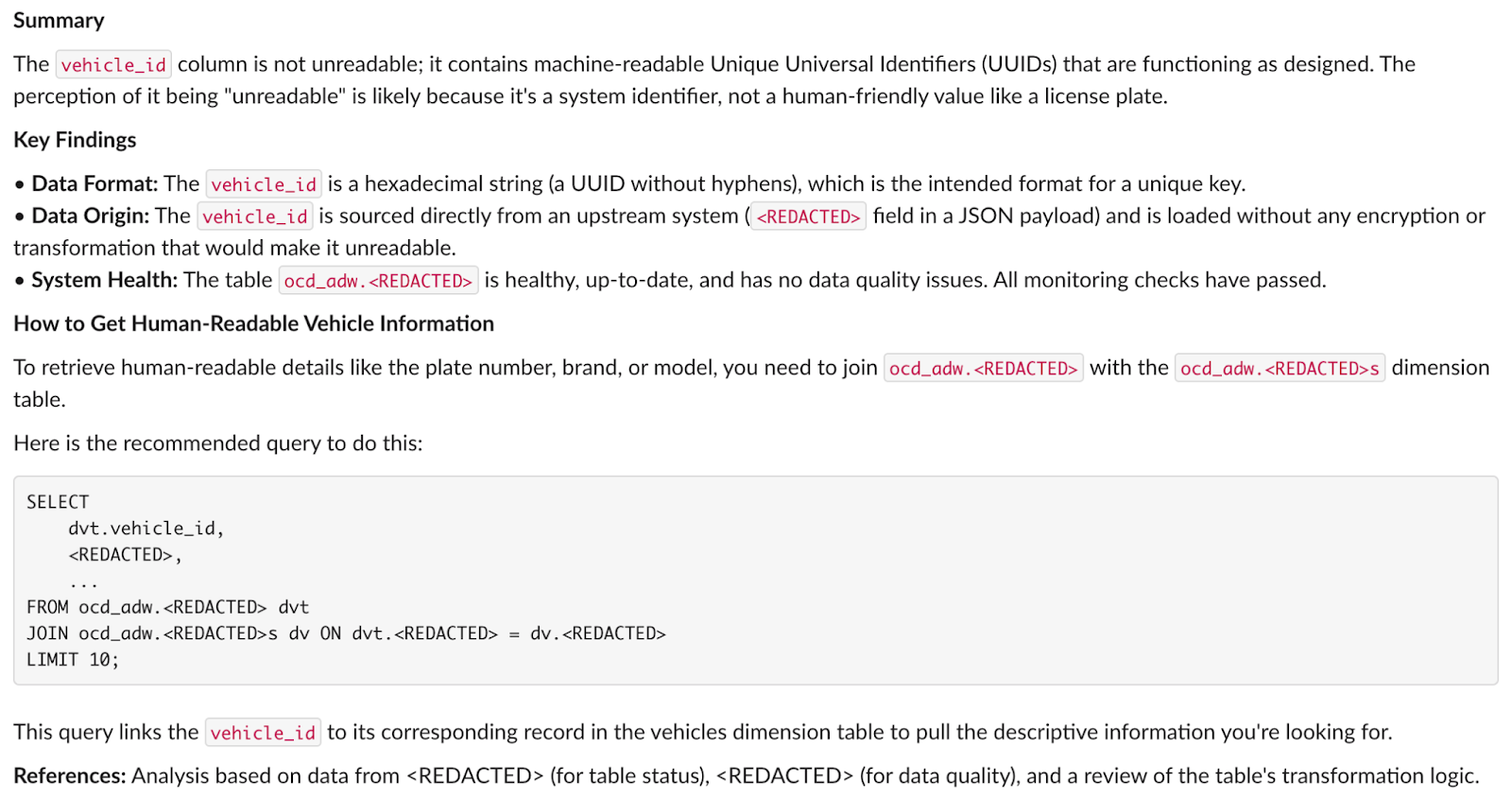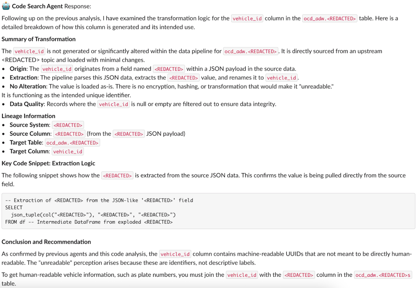 Example: It can trace a vehicle_id column from the final table back through 5 transformation steps to the original source, explaining each change along the way.