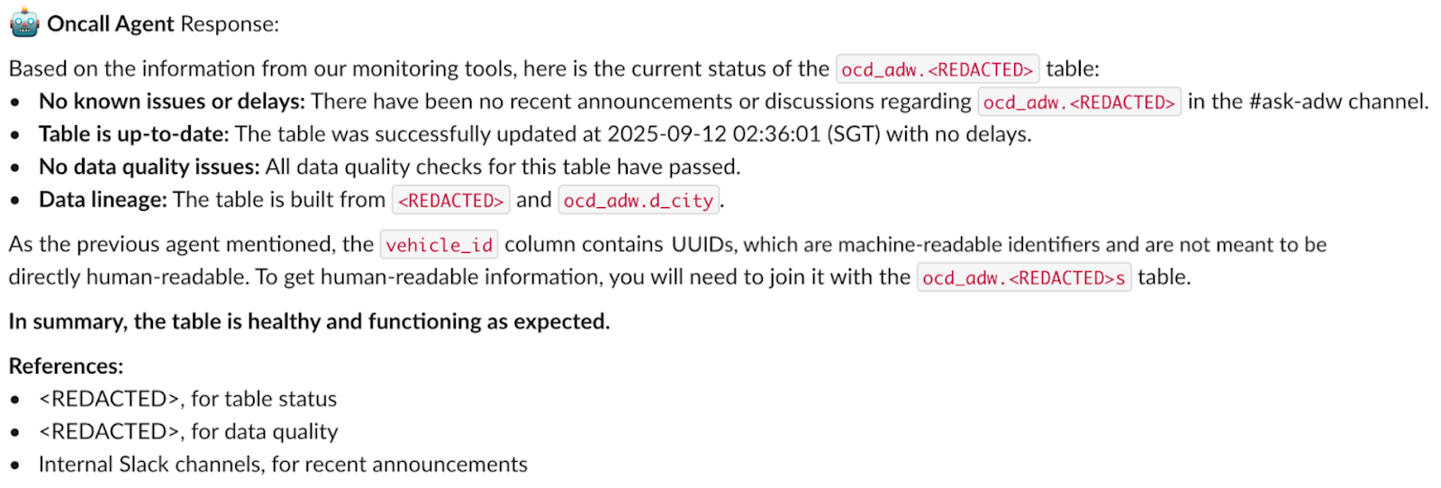 Example: If the Data Agent detects SLA breaches or missing partitions, it may consult the On-call Agent for production context.