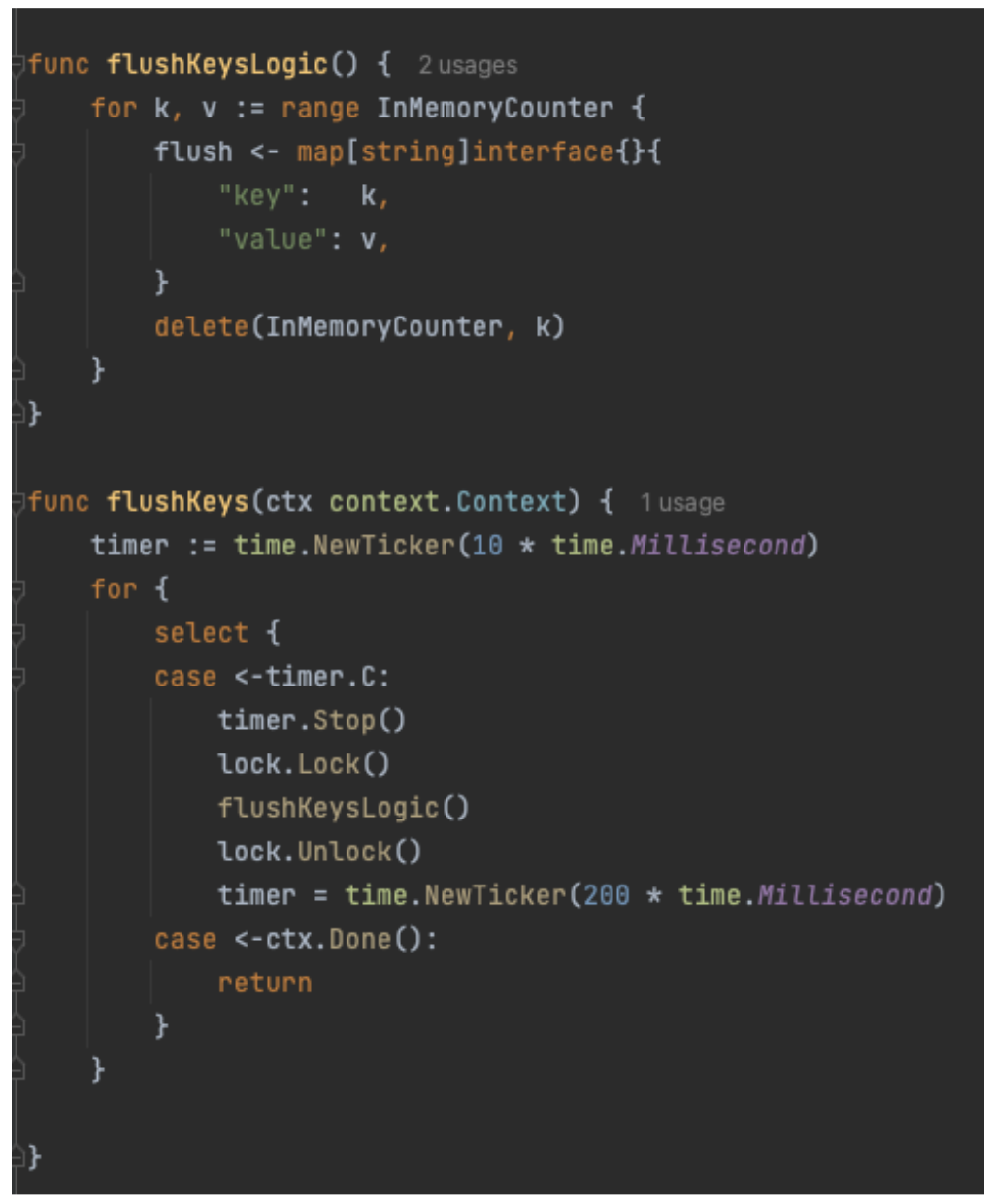 The code example for periodically flushing the counter value to the storage layer is shown in Figure 6. In the previous version of the code, it obtained the lock on the entire map and flushed the counter to the storage layer before releasing the lock. However, there is no locking during this flushing operation. Instead, we rely on the LoadAndDelete