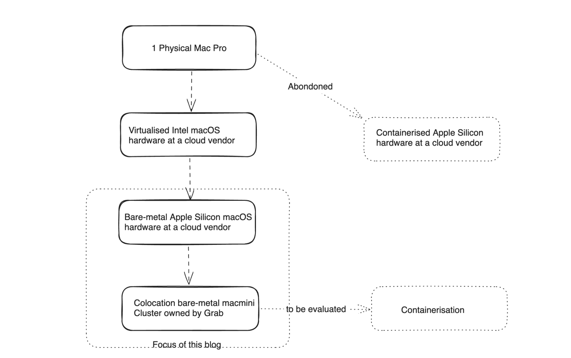Our macOS CI/CD infrastructure has evolved from 1 Physical Mac Pro running in our office to a cluster of 250 Mac minis fully occupied during peak hours of the day. There were multiple stages in the journey to transition to the current state. The following diagram shows the focus area for this blog post.