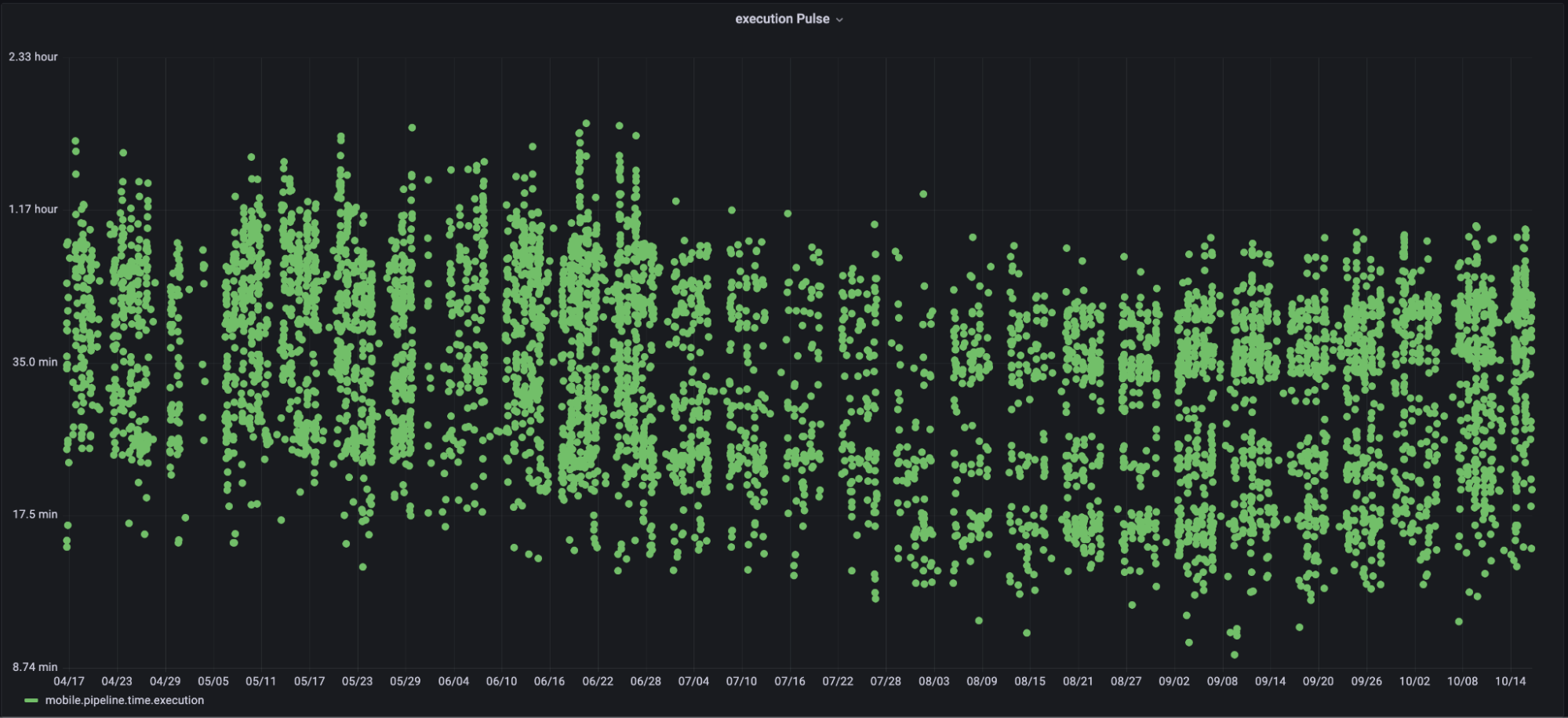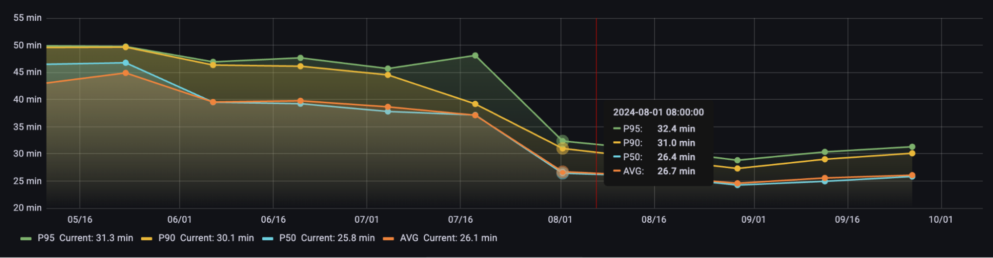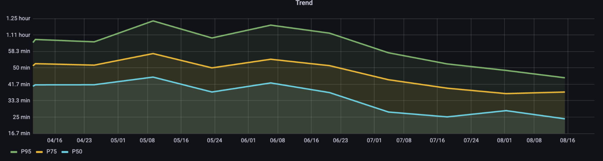 The following trend illustrations show how the performance of various tasks has improved while we progressively migrated to the new colocation setup.