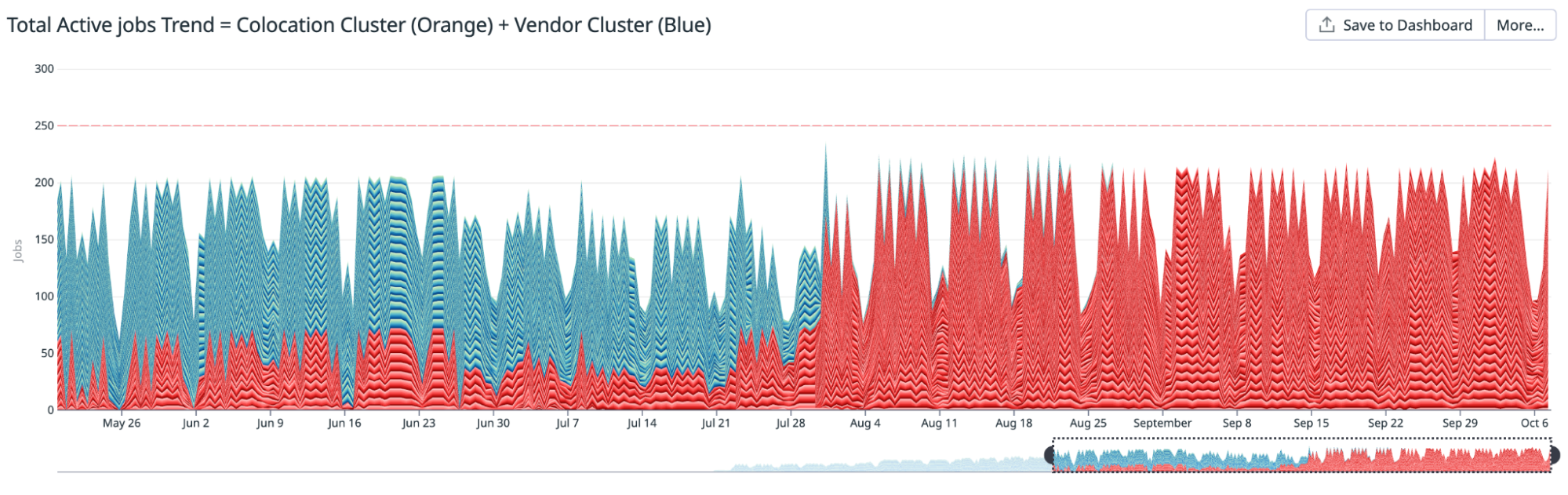 The total number of jobs trend is one of the data points to understand the demand situation. The following chart is a snapshot from our demand curve in 2022. Peak demand often started to exceed the available supply, creating queues for the jobs.